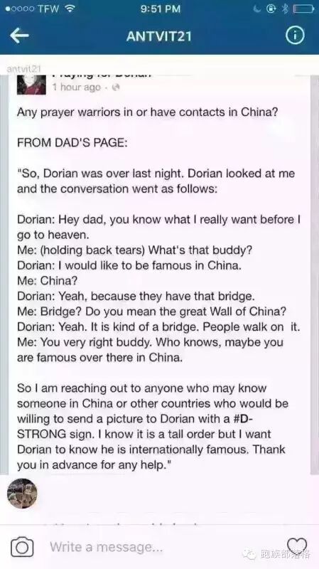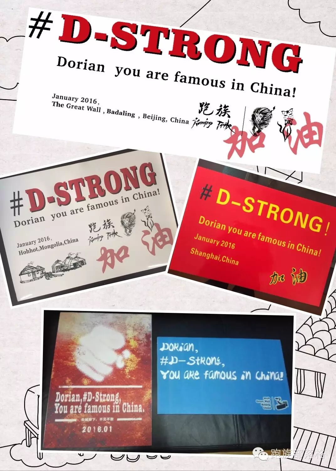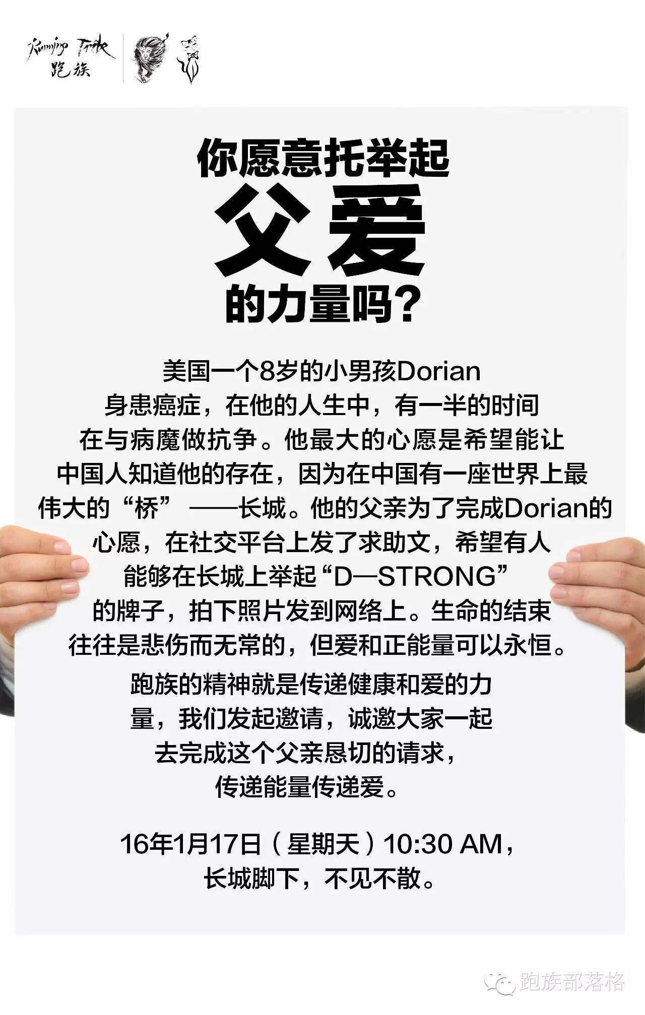 最后,小编在此有一个小小的请求:既然美国的请求可以传遍中国大江南北,小编想再次求助网络的力量,联系到小朋友的家人或朋友,把手上这副签满爱心人士名字的横幅送到Dorian的面前。请通过跑族部落格送联络信息给小编。小编在此,先谢过各位。